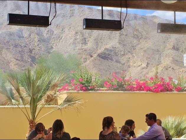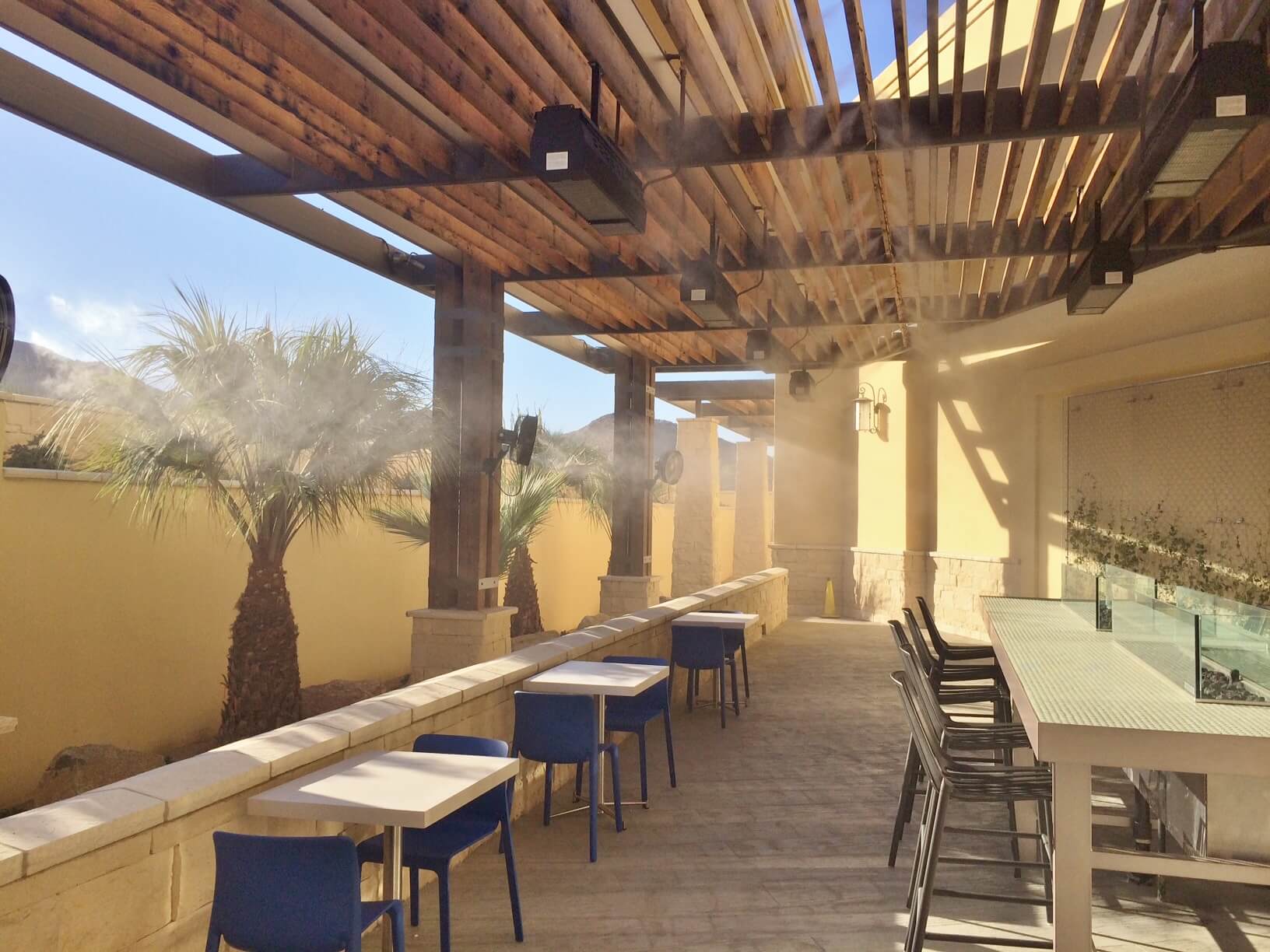 They were planning on multiple patios for eating & drinking, even a beer garden, but they wanted the patios to be comfortable for patrons year round. A challenging task in the Southern California Desert. We have temperatures up to 120° in the summer with normal highs closer to 115°. Come up with the ideal cooling solution for these patios they asked, and we delivered. With a combination of standard line mist and oscillating misting fans, we are able to drop the temperatures on the patio areas up to 30°.
