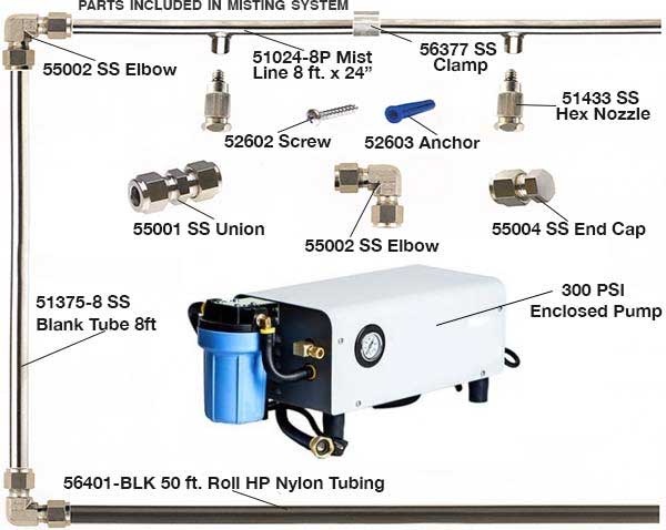 At 300 PSI the outdoor cooling mist provides heat relief and doesn’t leave much residual moisture to land on surfaces. For this cooling system there are additional tubing types available, along with a large inventory of choice of lengths.